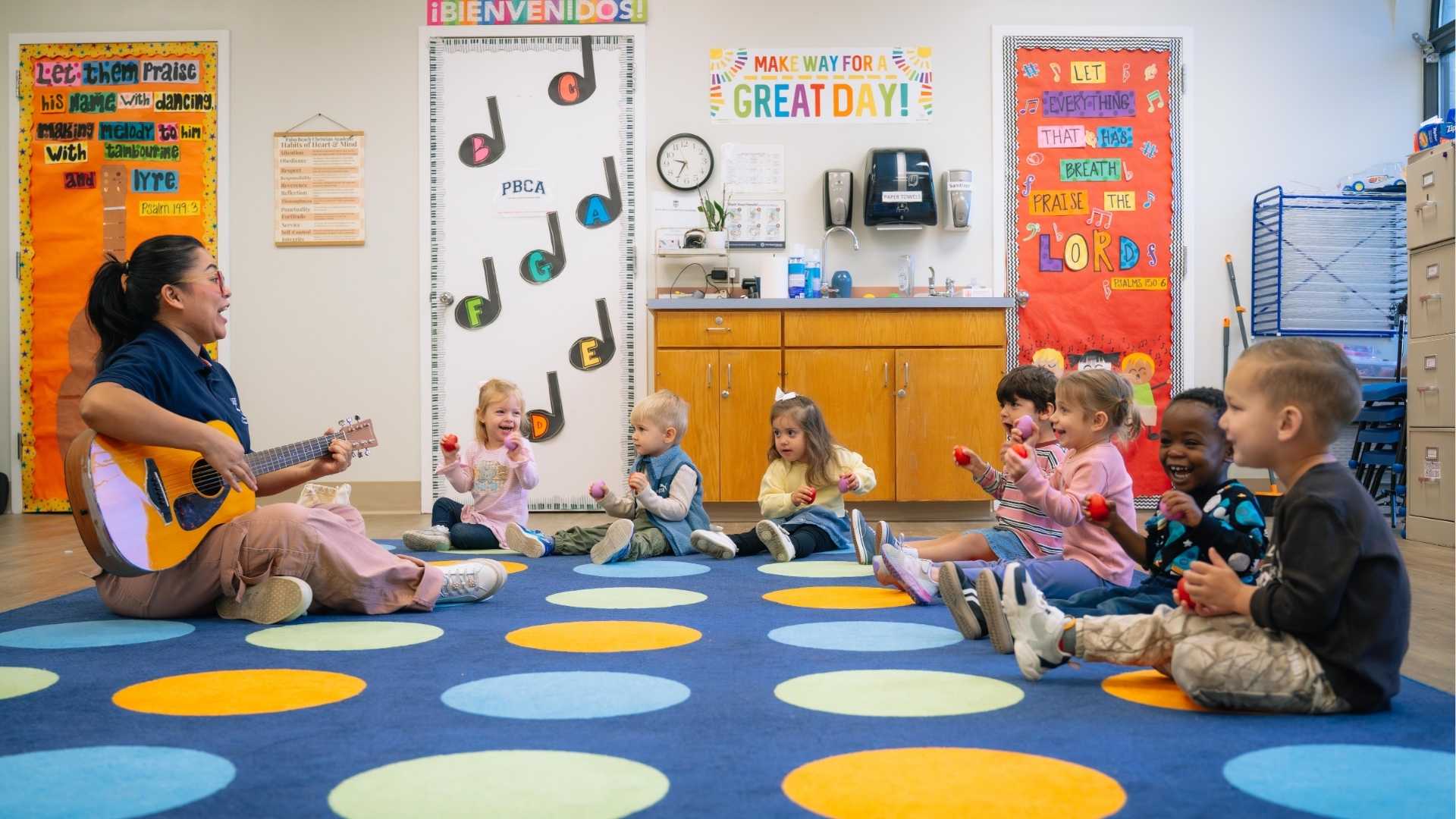 Daily circle time, Bible lessons, story sessions, and weekly chapel invite two's to grow in faith, language, and listening skills.